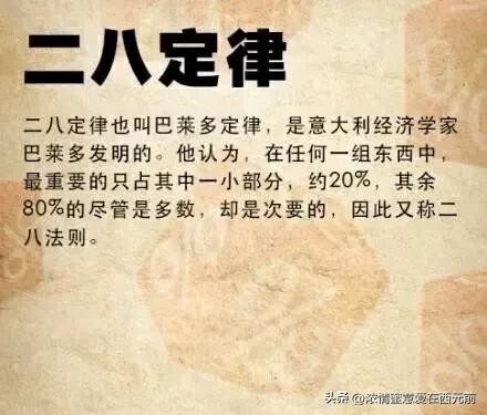 “80%的结果是由20%的因素决定的。”这个定律告诉我们,在生活和工作中,往往只有少数几个关键因素会影响到最终的结果,而大部分的努力和投入,其实是“水中捞月”,并不直接带来太多的回报。举个简单的例子:在一家公司,可能只有20%的核心员工,负责了80%的业绩;或者是你平时努力读了很多书,但往往只有其中的几本书,对你产生了真正的影响。