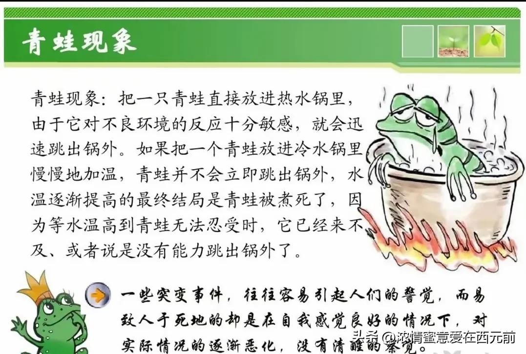 把青蛙放进冷水锅里,慢慢加温,青蛙并不会意识到即将发生的危险。它直到水温越来越高,才发现自己已经无力反抗,最终丧命。这一现象反映了人类对渐进性变化的麻木,许多危机往往是在逐步积累中悄悄到来,直到来不及挽回。