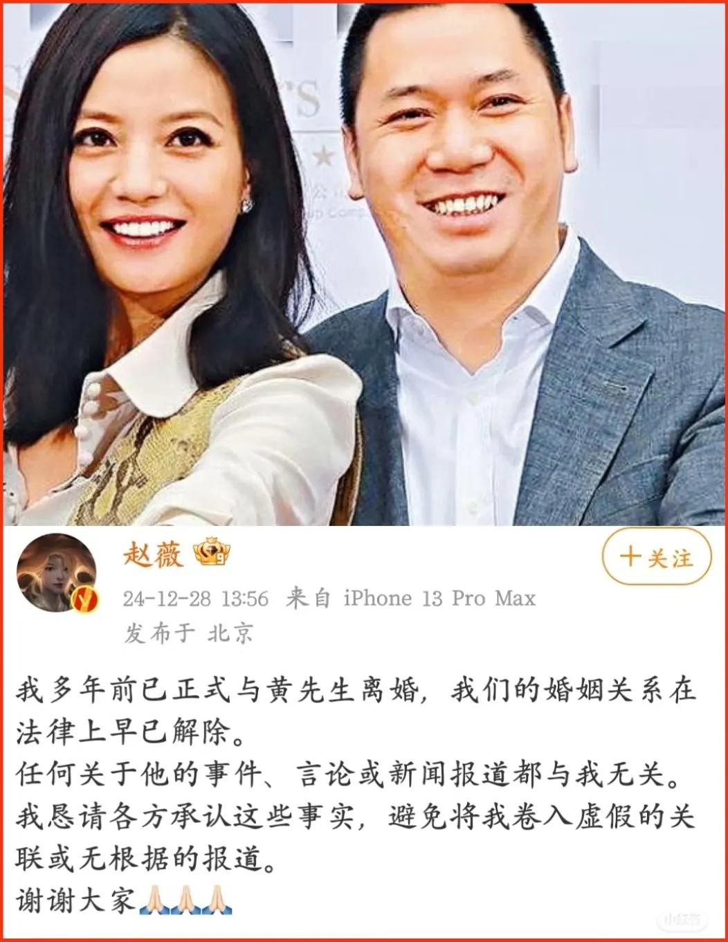 在2024年12月28日,赵薇发微博澄清已和黄有龙离婚的事实,并且让大家不要再传闻,要知道从2021年8月赵薇被定性为劣迹艺人以后,她就鲜有露面。