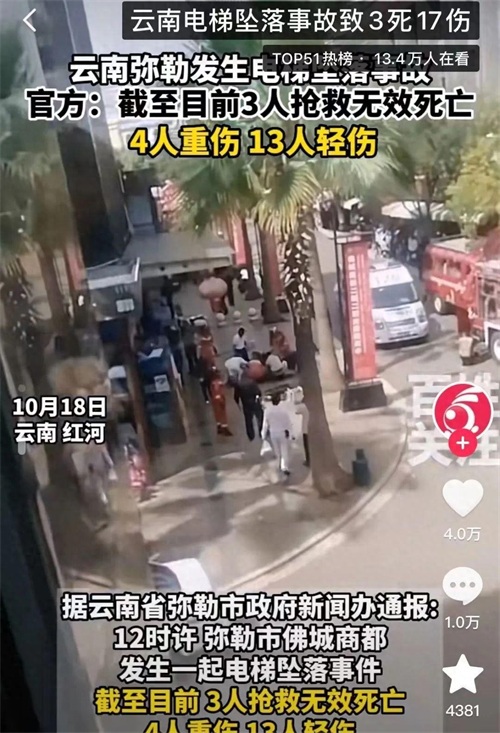 欢迎留言分享。电梯坠落事故近期频发,引起社会广泛关注。据悉,最近一起电梯坠落事件发生在佛山,事故中有10人死亡。除了一些基本的情况,还有一些细节值得我们深入思考。据知情人士介绍,这起事故中坠落的电梯实际上是一部货梯,因为可以直达商场外部,所以不仅菜农和消费者会选择乘坐,甚至有菜农会开三轮车将菜直接运入商场。