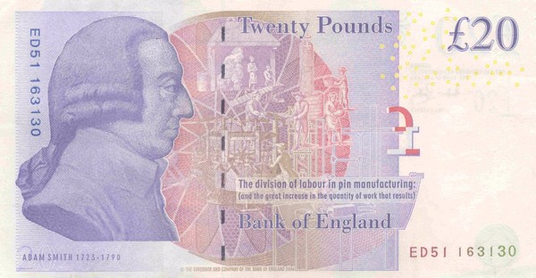 20英镑的背面是十八世纪著名的经济学家亚当·斯密(Adam Smith)。作为英国古典政治经济学的主要代表人物之一,他的《国富论》奠定了现代资本主义的理论基础。他也是第一个出现在英国钞票上的苏格兰公民。《国富论》该书被誉为"第一部系统的伟大的经济学著作,如果你是学经济这是一部必读的书。