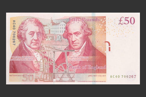 50镑背面印的是工程师詹姆斯·瓦特(James Watt)和企业家马修·博尔顿(Matthew Boulton)。这也是首次在英国的纸币背面印有两个人像。詹姆斯·瓦特是英国著名的发明家,也是工业革命时的重要人物。众所周知,他改良了蒸汽机,是工业革命的开端。而另一位马修·博尔顿是18世纪英国企业家,也是瓦特的商业合伙人,正是他倾尽全部精力和财力才促成瓦特的蒸汽机梦想,所以说这两位好基友牢不可分的存在了50镑的英镑上面。