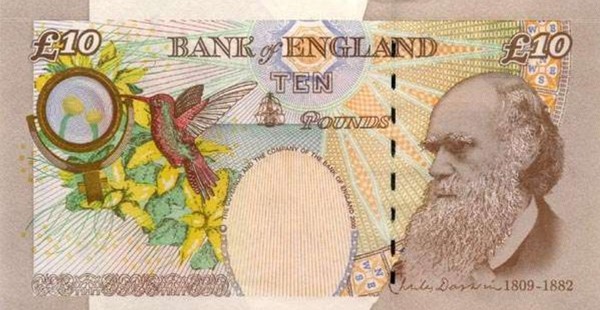 10英镑背面人物是大家都认识的查尔斯·达尔文(Charles Darwin),对就是那个说人是猩猩进化而来的生物学家达尔文。1809年2月12日,查尔斯·罗伯特·达尔文出生在英国小城什罗普郡郡治,1859年发表《物种起源》是现代生物学的基石,可能很多人可能不知道他是个英国人。