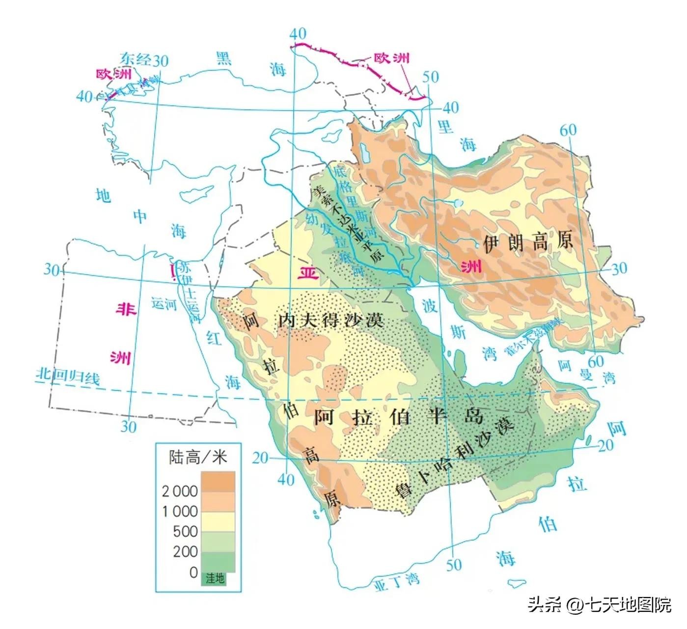波斯湾位于亚洲西南部,介于伊朗高原和阿拉伯半岛之间,是印度洋西北部的一个半封闭海湾。