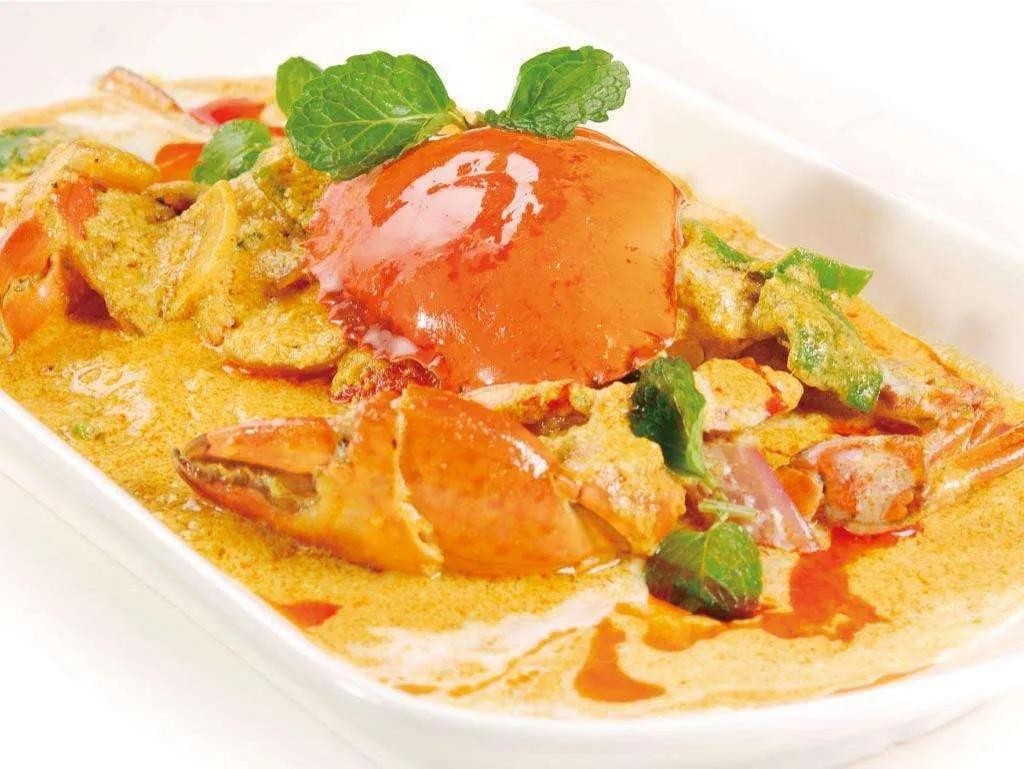咖喱炒蟹是极受欢迎的泰国名菜,切块的红蟹加上配菜与咖喱和各式香料共炒,突出蟹肉的鲜味与弹性。