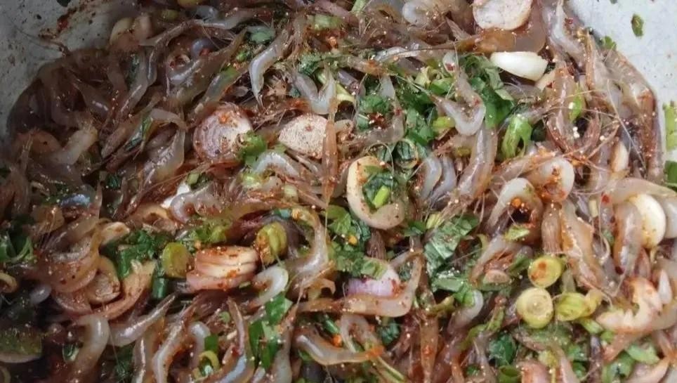 从水里捞起鲜活的小河虾,加上各种拌料:蒜片、柠檬草、生辣椒、红葱、柠檬汁、碎米、辣椒粉、鱼露、香菜、葱等搅拌均匀凉拌一下就可以直接吃了。