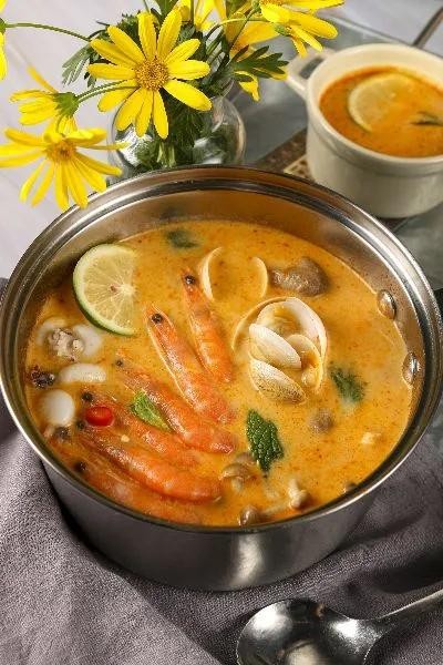 冬阴功汤是泰国的美食名片之一,在泰国非常普遍,普通人家常饮此汤,大小餐馆也都能吃到。这道汤的名字中,“冬阴”是酸辣的意思,“功”是虾的意思,翻译过来其实就是酸辣虾汤,也可以把虾换成其它海鲜和肉类。冬阴功汤看上去比较清淡,但实际味道较辣,不过习惯了之后不少人倒是会对它念念不忘。