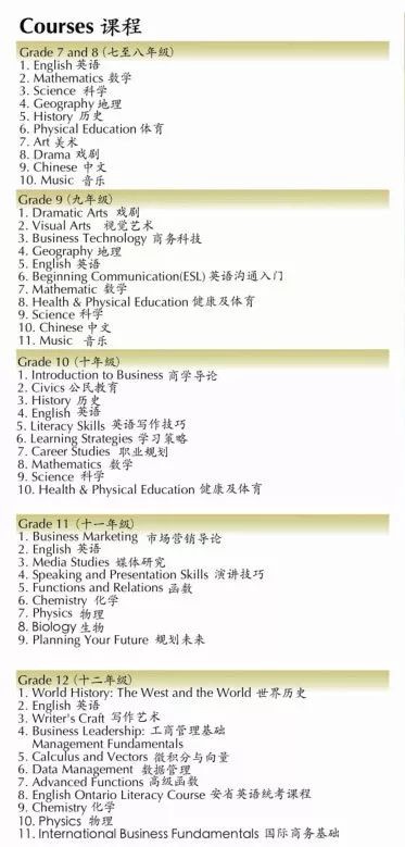该课程是由外籍教师英文授课,开设科目包括英语、数学、科学、商务概况、地理、艺术、职业规划、公众演讲技巧、学习方法等。此外,为了帮助7-8年级的学生顺利进入高年级,学校还额外开设英语强化及汉语选修课程,并专门为11-12年级的学生开设托福和雅思培训课程,旨在帮助即将毕业的同学入读理想大学。学校还会为高中插班的学生对已完成的课程进行评估,并给予相应的学分认可。