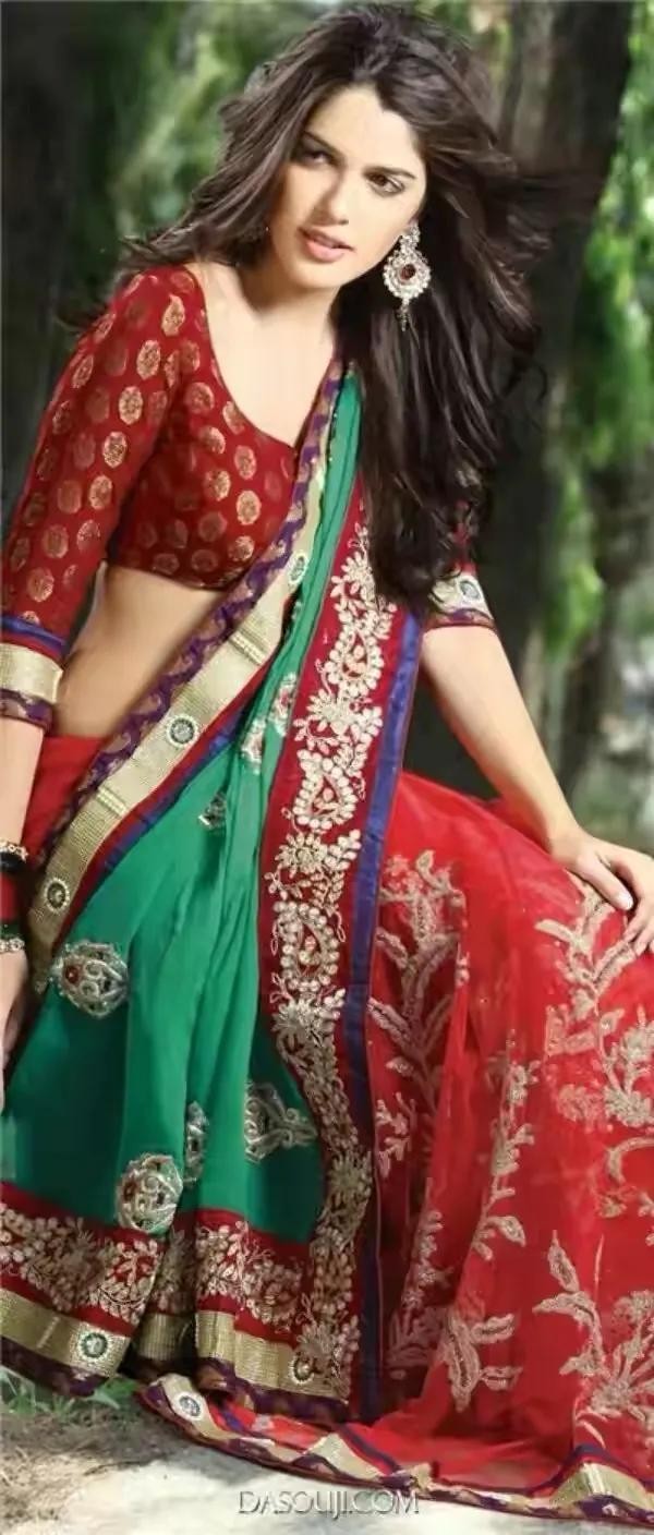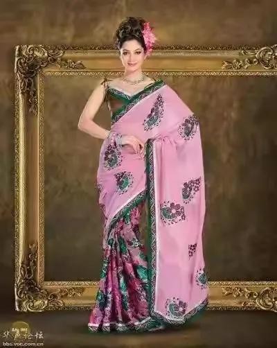 女性穿纱丽印度妇女传统服饰是纱丽(Sari),纱丽是指一块长达15码以上的布料,穿着时以披裹的方式缠绕在身上。印度妇女擅长利用扎、围、绑、裹、缠、披等技巧,使得纱丽在身上产生不同的变化。