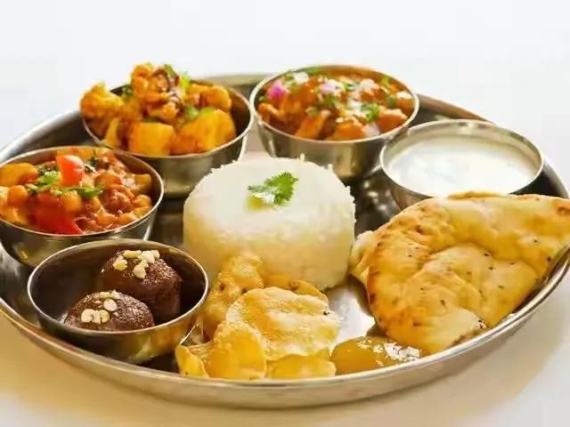 在印度Thali是一种较为传统的一种套餐,当你见到它的时候你可能会有一种这是韩国料理错觉,因为在一个圆形的盘子中,每个小碟子里都装着特色料理,米饭、面饼、酸奶、咖喱、水果、蔬菜、甜点等等。