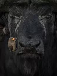 这张黄嘴啄木鸟坐在非洲水牛身上的照片获得了鸟类行为类银奖。