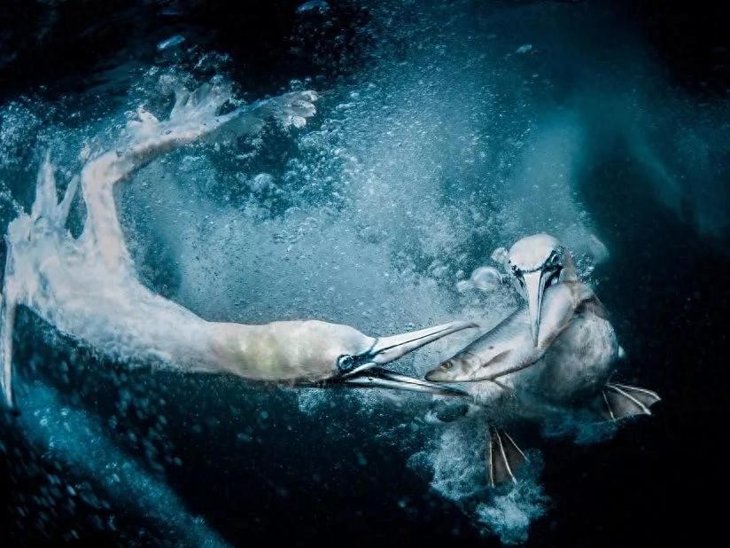两只塘鹅在苏格兰设得兰群岛附近海域争夺一条鱼的戏剧性照片荣获世界自然摄影奖一等奖。