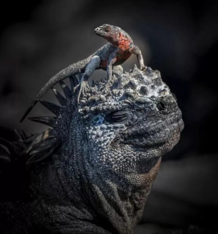 同样是在加拉帕戈斯群岛拍摄的,来自英国的约翰·西格 (John Seager) 凭借这张照片获得了两栖动物和爬行动物行为类别的金奖,这张照片展示了一只熔岩蜥蜴站在海鬣蜥上。