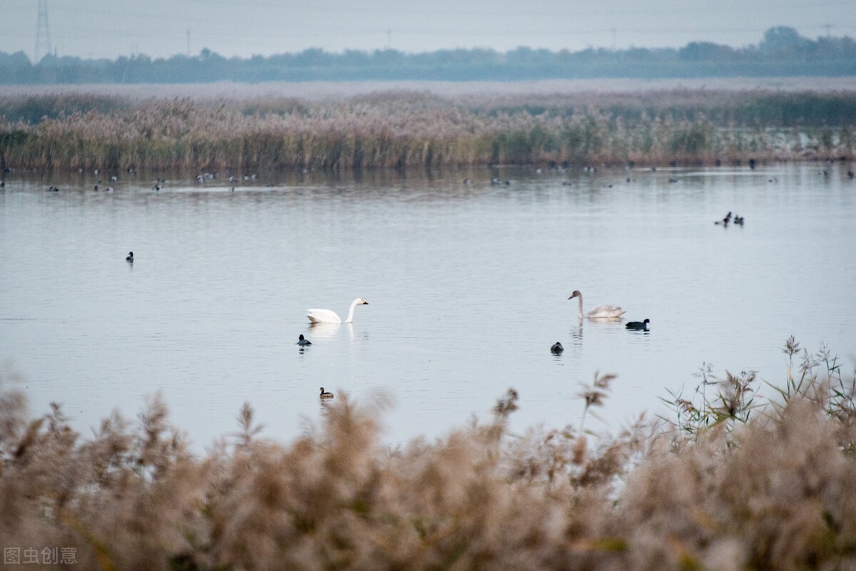 官港森林湿地公园,典型的湿地景观,有湖泊,有很多野鸭子在水里觅食。