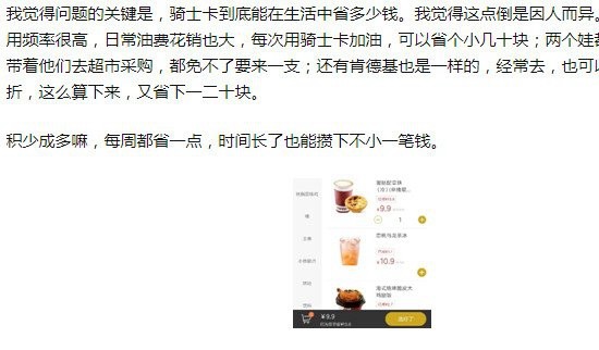其余还有用户举了一个肯德基的例子,在骑士卡上这也是有优惠的,然而是这只限于肯德基的直营店运用,假如你本人不留神下单了还不行退。还有人关于于骑士卡商城的效劳也不是很满足,有用户在上头购置了商品,厥后创造有问题,找客服,然而是客服并不是卖家的客服,这便引导处理这件事务变得格外烦恼,如许的购物感受信赖许多人都不喜好。