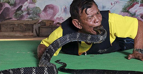 泰公有一位牛人,敢用嘴去亲吻世界上最毒的毒蛇之一眼镜蛇,吻下大师大概想说这有什么,那交下来便利害了,生吞眼镜蛇,这点便利害了,那为什么眼镜蛇不会咬他呢?戴你瞧瞧背地的缘故。