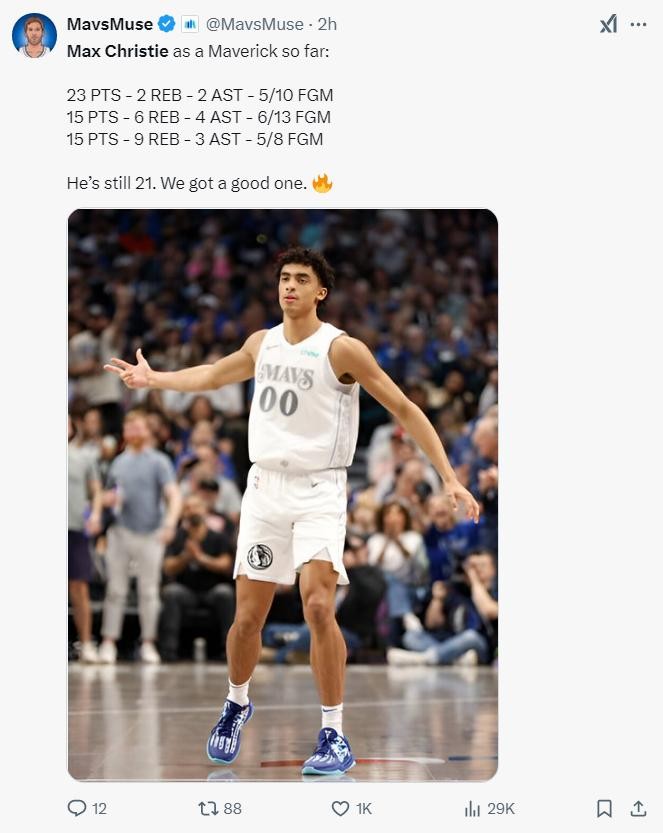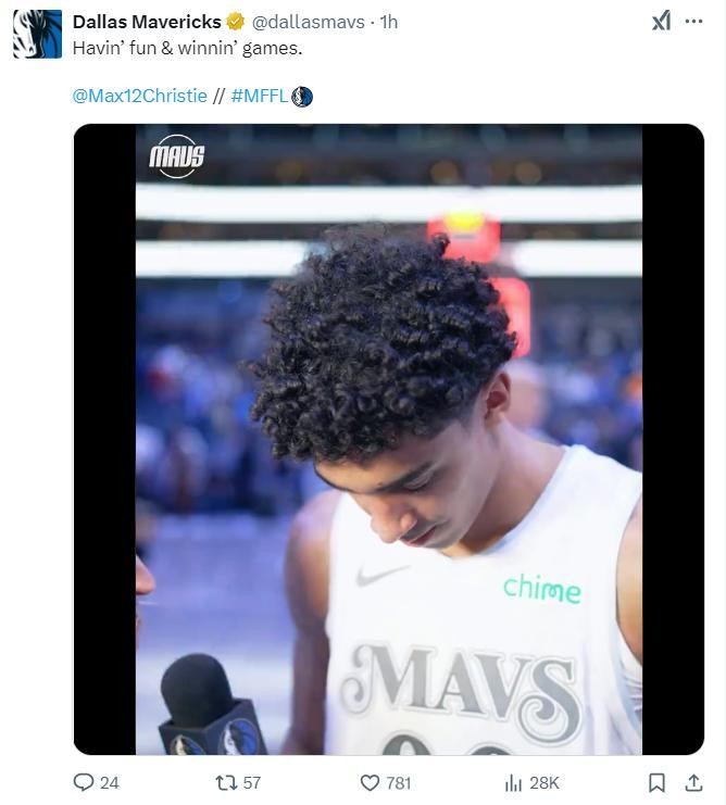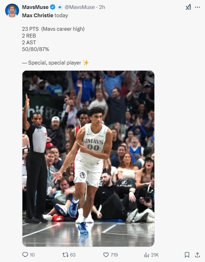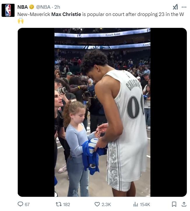 赛后接受现场采访的人是前湖人球员马克斯-克里斯蒂,小克说:“我们就是更多传导球,开心的打球愉快的打球,最终赢得胜利。”(很多人觉得他不适合独行侠的进攻体系,他是最失意的人,结果他来到独行侠就立马融入)