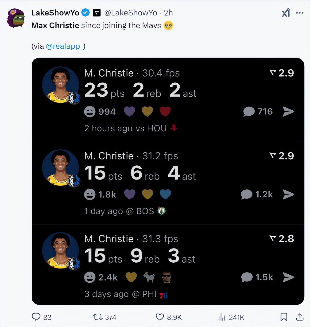 湖人媒体都晒出克里斯蒂三场比赛的数据,发了一个眼泪汪汪的表情。