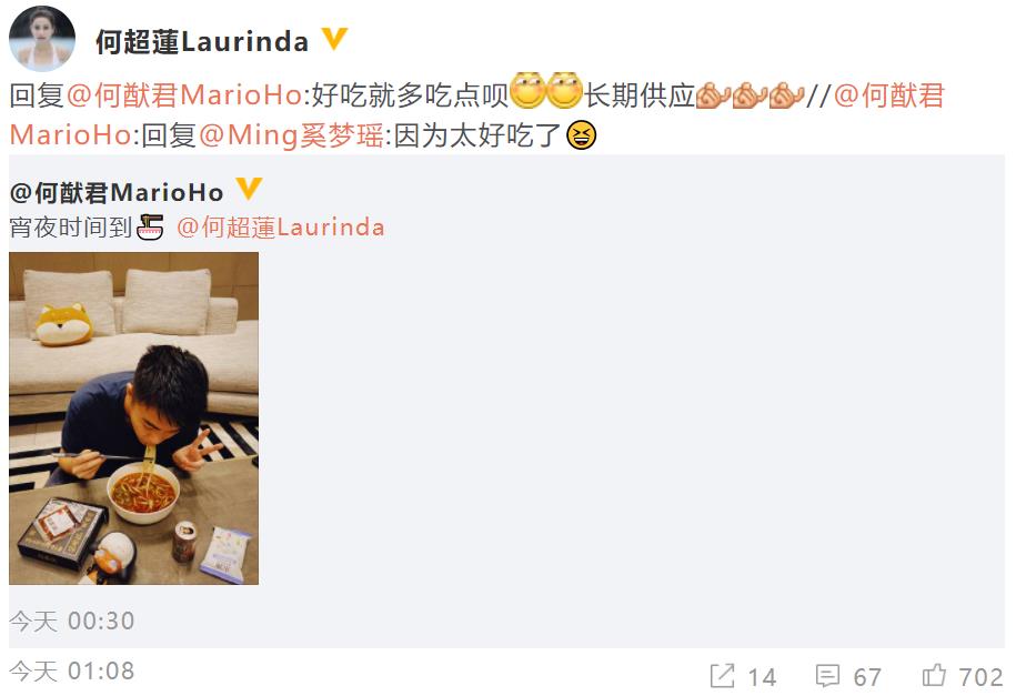 何猷君的妻子奚梦瑶随后在何猷君微博评论中留言调侃:“大半夜吃吃吃吃吃吃。”他见状回复:“因为太好吃了。”何超莲也转发微博表示:“好吃就多吃点呗,长期供应。”何超莲是何鸿燊的三房女儿,何猷君主动和何超莲互动,打破姐弟反目成仇的传闻。