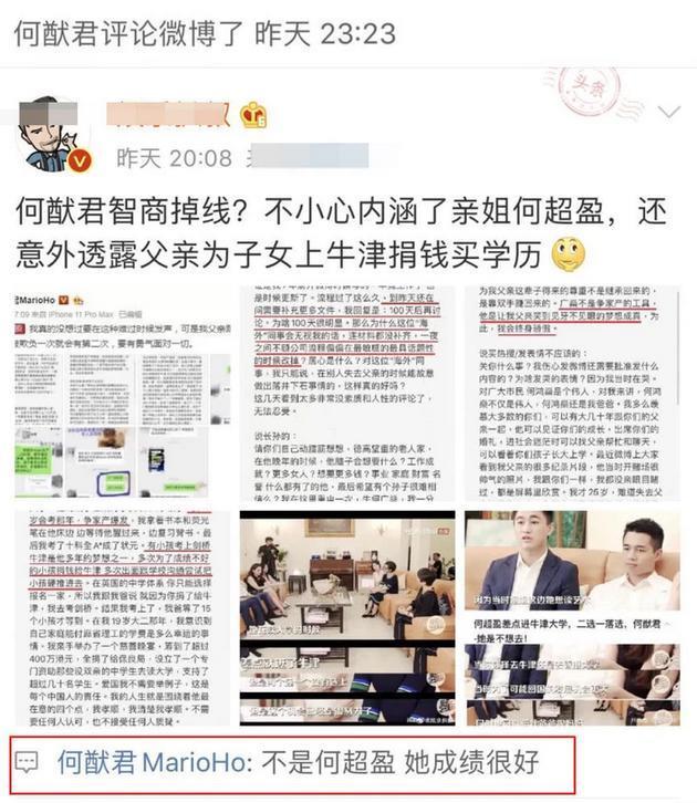 有网友猜测:何猷君文中“花钱上名校的子女”是同父同母的姐姐何超盈。何猷君留下评论:“不是何超盈,她成绩很好。”何猷君的情商太低了,怎么能亲自下场回应呢,既然否认是何超盈,那就是何超莲了?