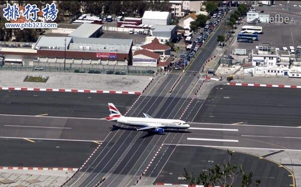 不知道是哪位天才设计的直布罗陀机场,机场的跑道中有一条四车道的马路穿过。这里还有利比里亚半岛上形成的高压天气,岩石上方乱流在90米处形成吹往地面的下坡急流,给降落造成很大困难。但是最奇葩的是直布罗陀机场是英国和西班牙的争议地带,控制权的事情都还没搞清楚,飞机来机场前还需要征得西班牙的同意。