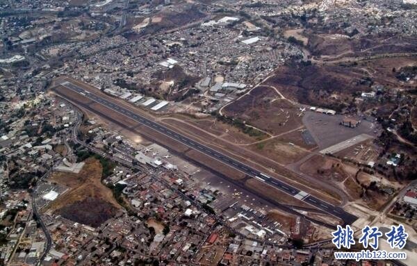 这是世界上跑道最短的国际机场,中途有公路穿过,而且跑道的末端是悬崖。特岗汀机场位于洪都拉斯首都特古西加尔巴,坐落在高耸的马德雷山脉中。飞机一定要快速下降进场,不只是由于周围地形,更重要的是着陆跑道太短。而且周边都是房屋,一旦有事故发生无法迫降。