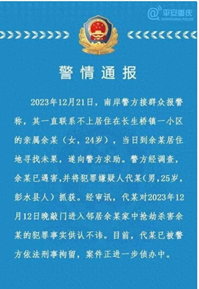 重庆悲剧揭秘:24岁女子在家失联,警方曝光25岁男邻居抢劫杀害