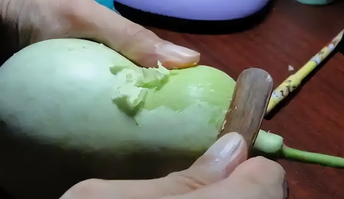 2. 去皮处理:待葫芦表面稍微发黄后,使用竹片或木片轻轻刮除葫芦表面的蜡质层,避免使用金属工具以防损伤表皮。