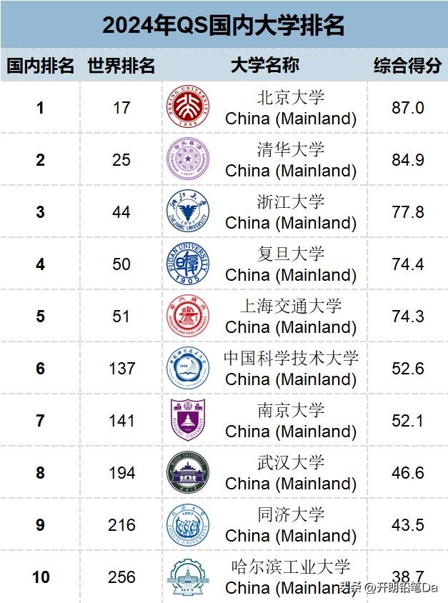 以2024年最新QS全球所有大学排名来看,国内十大最好的学校分别是:北京大学、清华大学、浙江大学、复旦大学、上海交通大学、中国科学技术大学、南京大学、武汉大学、同济大学、哈尔滨工业大学。