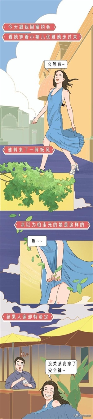 所以对于女孩子来说,一般会在裙子下面穿上安全裤防止走光,但是也因此闹出了很多的搞笑事情,那么女孩子夏天裙子底下到底藏了哪些秘密呢?下面就通过一组漫画的形式带大家来了解一下。