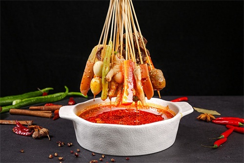 钵钵鸡是四川人夏天的必备食物。将鸡肉、鸡杂、毛肚、牛肉、土豆、藕片、豆皮等食物放入钵中,再将鲜香麻辣的汤料拌在一起,浸泡入味后,就可以品尝了。麻辣的口感加上丰富的食材,给人一种清凉的感觉,既可以当零食吃,也可以当作米饭的配菜。
