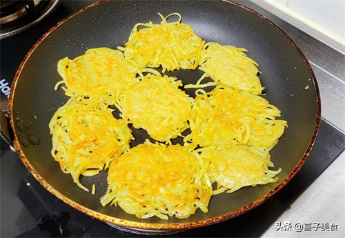 第4步、淋入少许花生油,全程用小火,将土豆丝饼烙至一面成型后再翻面,一开始切记翻动,直到土豆丝饼两面都烙至金黄出锅。
