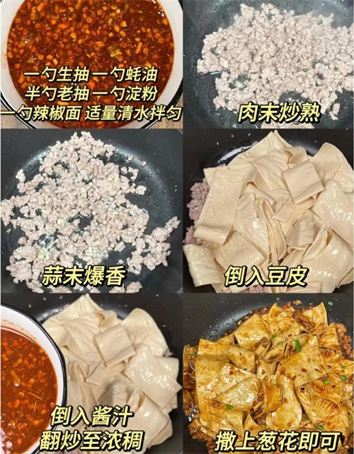 2.锅中倒油,油热下入肉末炒熟,下入蒜末爆香,倒入提前泡好的豆皮,倒入酱汁,翻炒均匀,大火收汁,撒上葱花即可出锅!