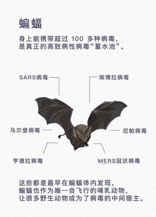 可是,蝙蝠身上有很多种病毒,早期的“非典”的病源就是蝙蝠。如今的“NCP”同样也是来源于蝙蝠。为什么蝙蝠身上的病毒会传到人身上?一些不法分子为了暴利,捕野生动物换取钱财,更可恨的一些变态人,竟然吃一些蝙蝠和野生动物。最终导致恶果灾难'疫情。