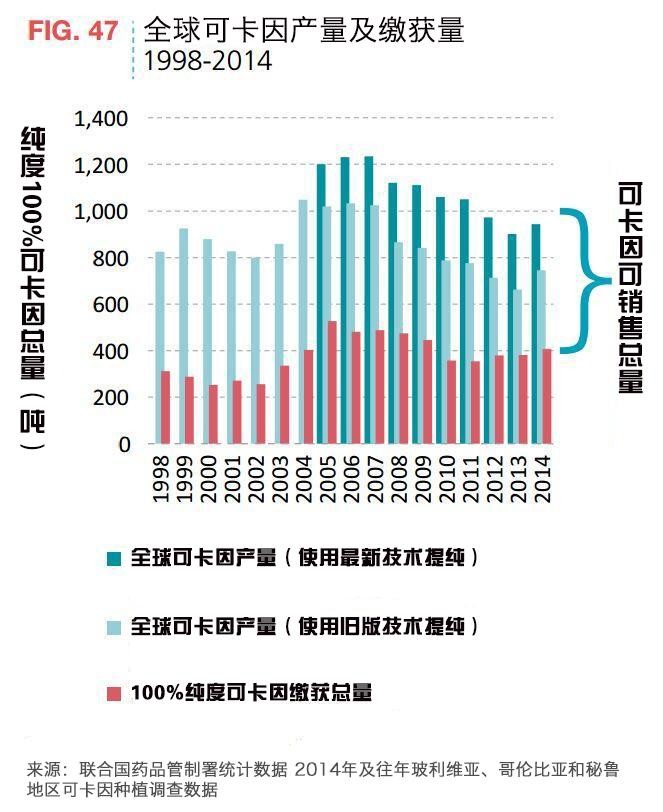 在1998年至2014年之间,全球可卡因种植量下降了30%之多,在2000年时,种植量下降了40%,达到近年来下降数值最大的一年。