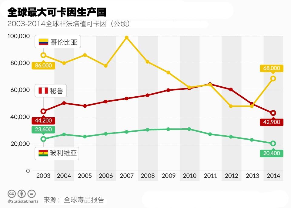 下面,根据德国统计公司Statista公布的图表显示,2014年哥伦比亚超过秘鲁,恢复了其世界领先的可卡因生产国的地位: