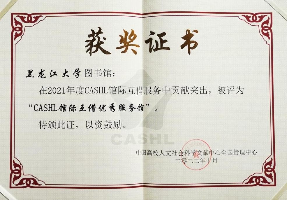 黑龙江大学图书馆荣获 “CASHL馆际互借优秀服务馆”称号