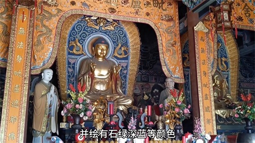 3. 大雄宝殿供奉三身佛,佛像庄严而坐,面容慈眉善目,温婉典雅,背光采用玄素,并会有石绿、深蓝等颜色,使得立体感很强,烘托出佛的庄严肃穆之感,山墙会有水路壁画,又称人神行进图,人物众多,形态各异,内容包括汝、石、道、各色人等。