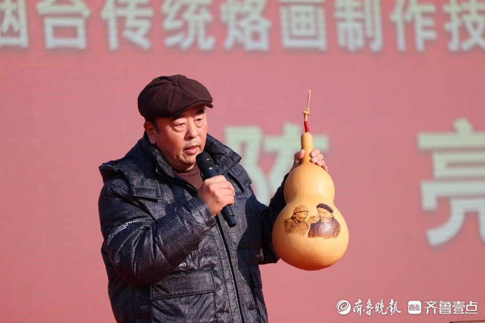 烟台传统烙画制作技艺传承人陈亮展示葫芦烙画作品。