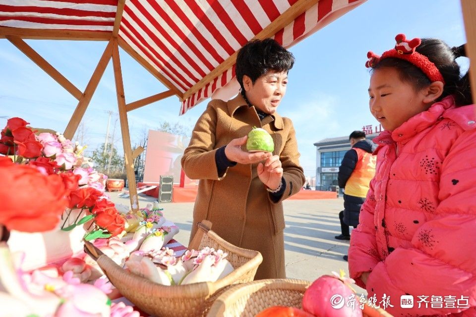 胶东花饽饽展位前,于志娜为小朋友讲述花饽饽习俗。