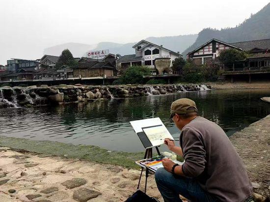 支一个画架,携一支画笔,研学采风间,索溪河畔的美景便跃然纸上。远处青山如黛,清澈的河水叮叮作响,岸边树木斜垂,在水面上投下斑驳倒影,虚实相映,水波荡漾下别有一番韵味;近处鸟鸣幽幽,独具特色的屋舍和来往的行人点缀其间,轻描淡写就是一幅安逸静谧的写实风景画卷。