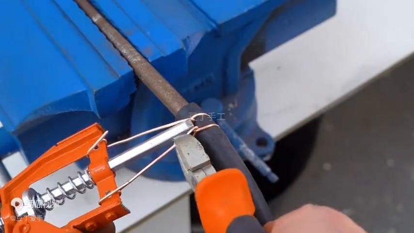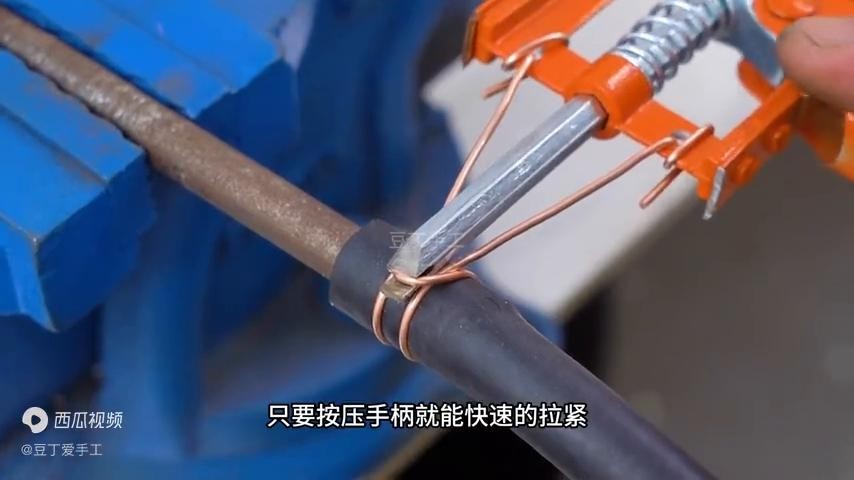 ·第三个、找一个报废的玻璃胶枪,用角磨机从尾部切开,并用电钻分别在尾部钻两个直径3毫米的孔,然后用砂轮机把顶杆打磨成扁平状,并用角磨机切割出缺口,把铁丝穿入孔中缠绕好,只要按压手柄就能快速的拉紧,赶紧试试吧!