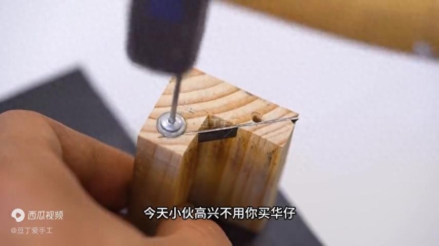·第六个、找一块木板,用记号笔在表面做好标记,分别用电钻在表面打孔,并用切割机沿着标记切割一条缝。找一片美工刀夹在缝隙中,并用螺丝固定好,顶部同样用胶水固定,撒上盐后粘接的会更加结实。这样给电线去皮真是太方便了。