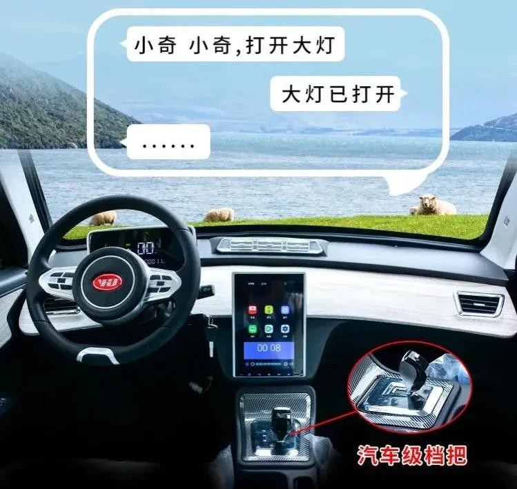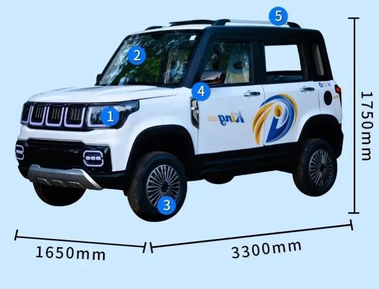 车身采用了双层高温汽车烤漆工艺,粘贴了简易的logo贴花,显得车辆清新脱俗。在车身尺寸长、宽、高分别为3300mm、1650mm、1750mm的基础上设计了五门五座的格局,再加上钢化玻璃、加宽真空轮胎、金属件行李架、活动后视镜等一些小物件,使得车辆空间宽敞且又大气。