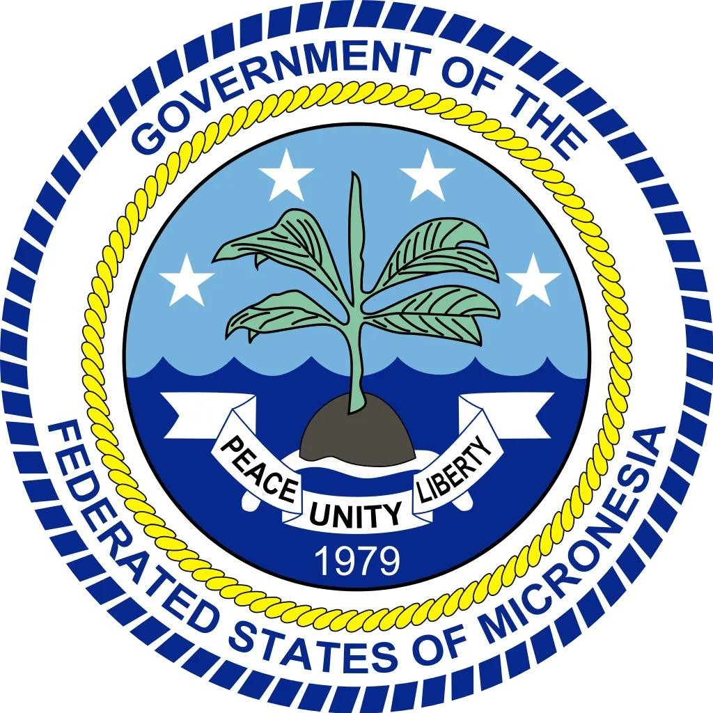 密克罗尼西亚国徽呈圆形,中心图案是一颗漂浮在海面上的发芽的椰子,天空中有四颗象征四个岛群的五角星,椰子下方是一条白色的绶带,上面用英语书写了“和平、统一、自由”的字样。绶带下方是密克罗尼西亚联邦成立的时间1979年。外圈用英语书写了“密克罗尼西亚联邦政府”的字样。