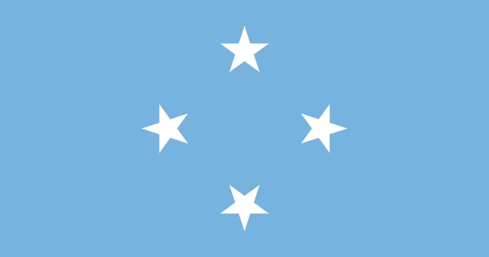 密克罗尼西亚联邦的国旗为浅蓝色底上菱形排列的四颗星。天蓝底色,代表太平洋,四颗白色五角星代表了四个岛群,即雅浦(Yap)、丘克(Chuuk)、波纳佩(Pohnpei)和科斯雷(Kosrae)。
