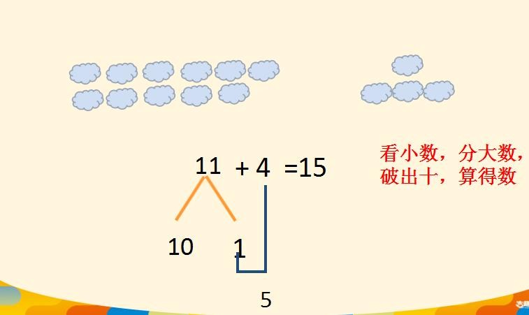 例如11+4=15这道题中,将11分成10和1,1+4=5,10+5=15.。