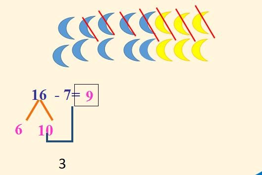 例如16-7=9这道题中,16的个位是6,十位是1,将16分成10和6,7比6大,所以就将分的大数10写在靠近7这边。10-7=3,6+3=9.