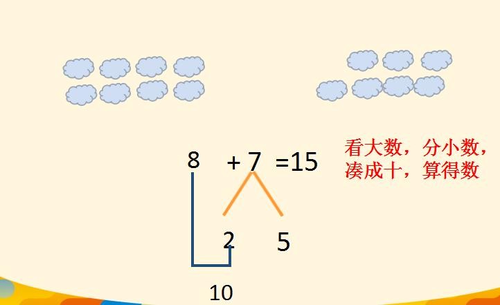 例如在8+7=15这道题中,8和7比较,7是较小的数字,8和几凑成10,8和2凑成10,所以将7分成2和5,8+2=10,10+5=15。