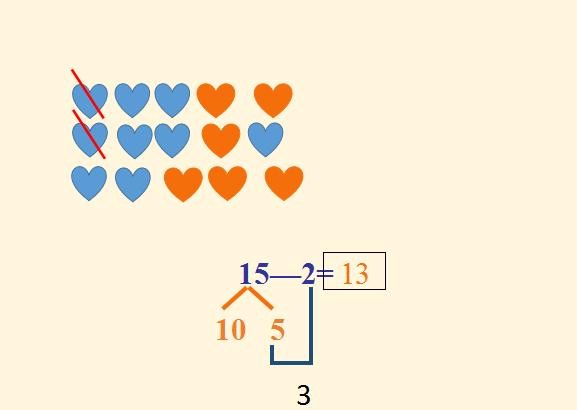 例如15-2=13这道题中,15分成10和5,5比2大,就将5写在靠近2这边,5-2=3,10+3=13。